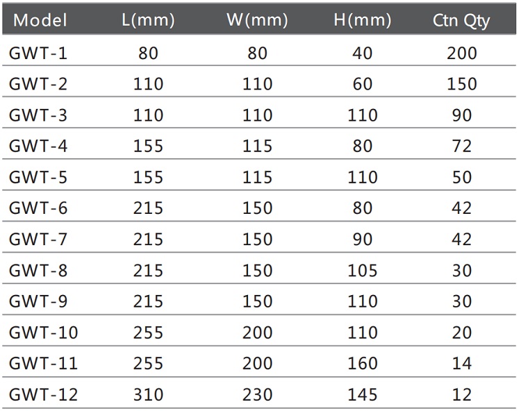 | مدل | طول (میلیمتر) | عرض (میلیمتر) | ارتفاع (میلیمتر) | تعداد در کارتن |