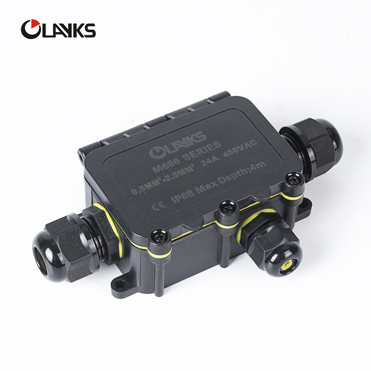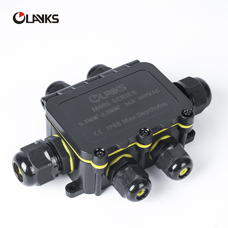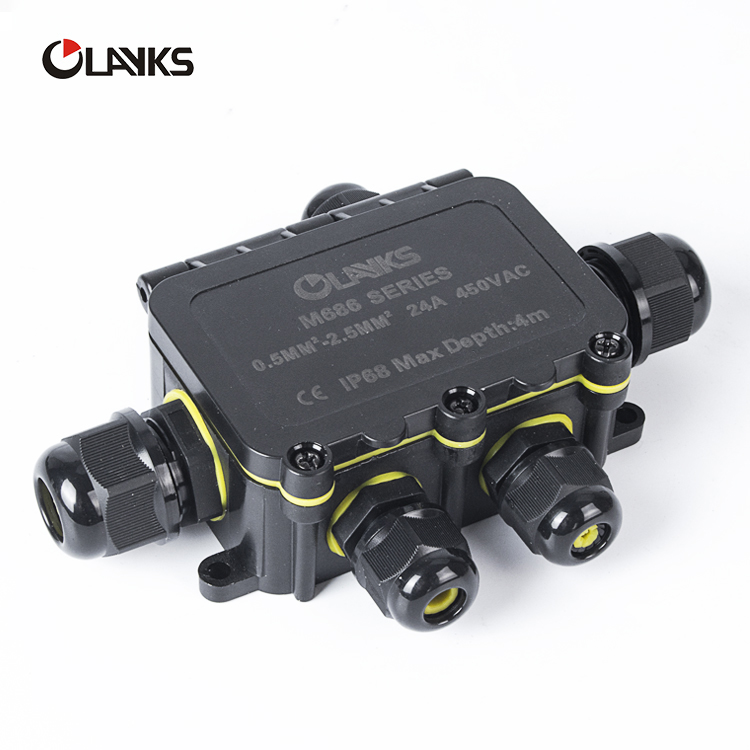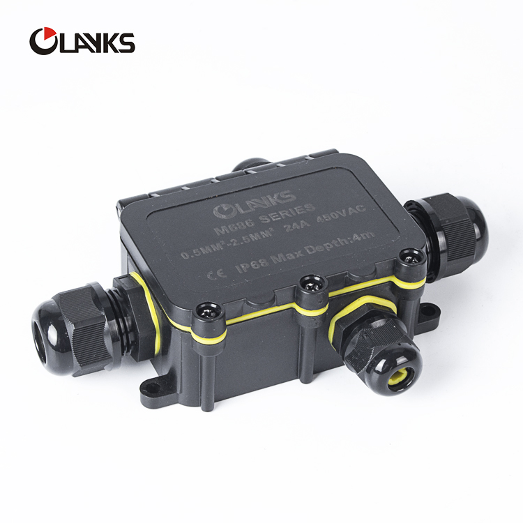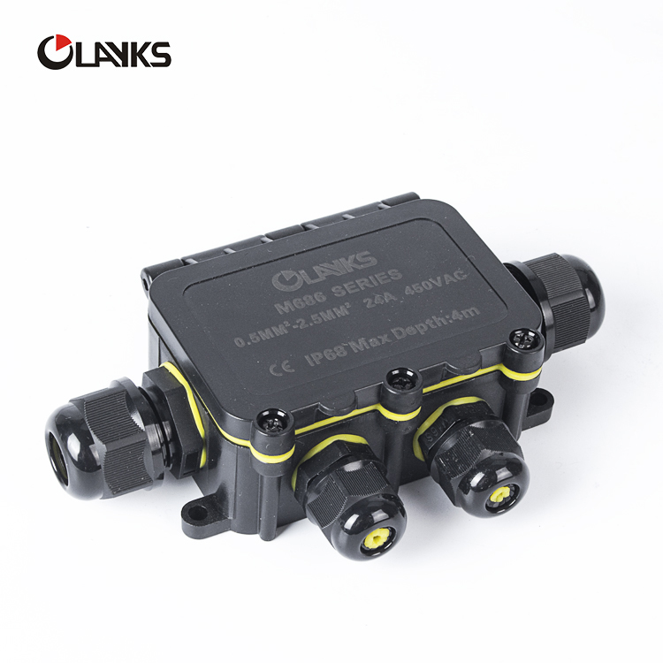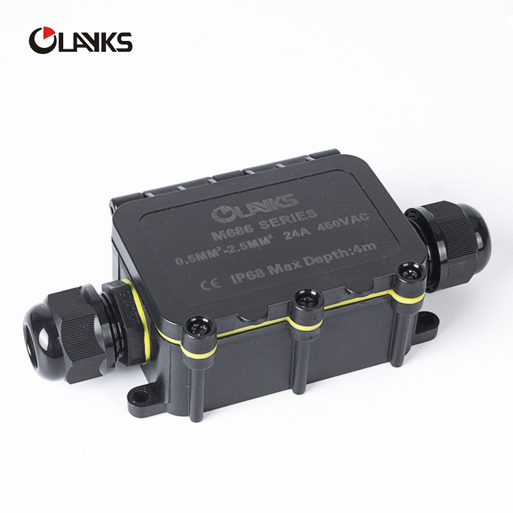 (1) صندوق التوصيل المائي ثنائي الاتجاه Olayks M686-2T مصمم لتوصيلات الكابلات الآمنة في البيئات الخارجية القاسية.