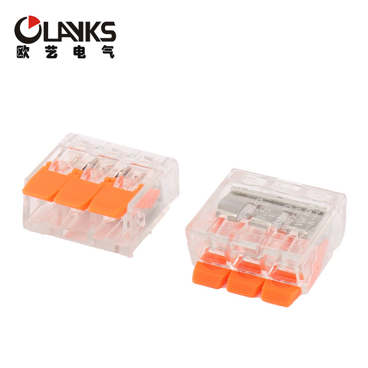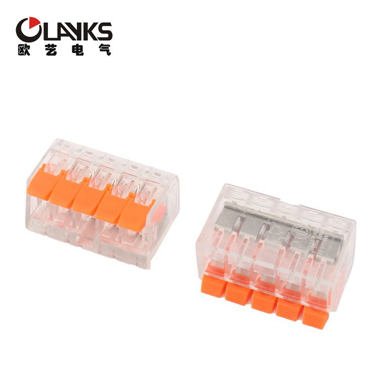 (1) سلسلة PCT-41 من موصلات الأسلاك المدمجة الشفافة ذات العتلات البرتقالية للتثبيت السريع دون أدوات. (2) تدعم الأسلاك الصلبة 0.2–4.0مم² والأسلاك المرنة 0.14–4.0مم². (3) مصنفة بجهد 450 فولت/32 أمبير لضمان اتصالات آمنة ودائمة. (4) مثالية للإضاءة والأجهزة الكهربائية وصناديق التوزيع. (5) متوفرة بتصميمات ثنائية وثلاثية ورباعية وخماسية المخارج لتطبيقات كهربائية متنوعة.